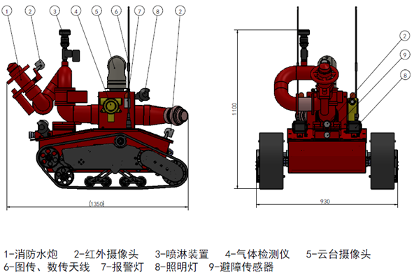 消防滅火機器人采用履帶式底盤、搭載消防水炮、溫濕度變送器、攝像機、照明等不同上裝,代替消防救援人員進入高危、有毒、缺氧、易爆等危險災害事故現場進行探測、救援、滅火,有效的解決消防人員在上述場所面臨的人身安全、數據信息采集不足等問題。對提高救援安全性、減少人員傷亡具有重要意義。
